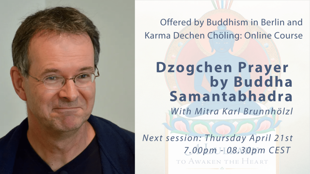 Mitra Karl Brunnhölzl will teach on the Dzogchen Prayer by Buddha Samantabhadra (Küntu Zangpo Mönlam), in which – figuratively speaking – our Buddha Nature is asking us to finally recognize itself.