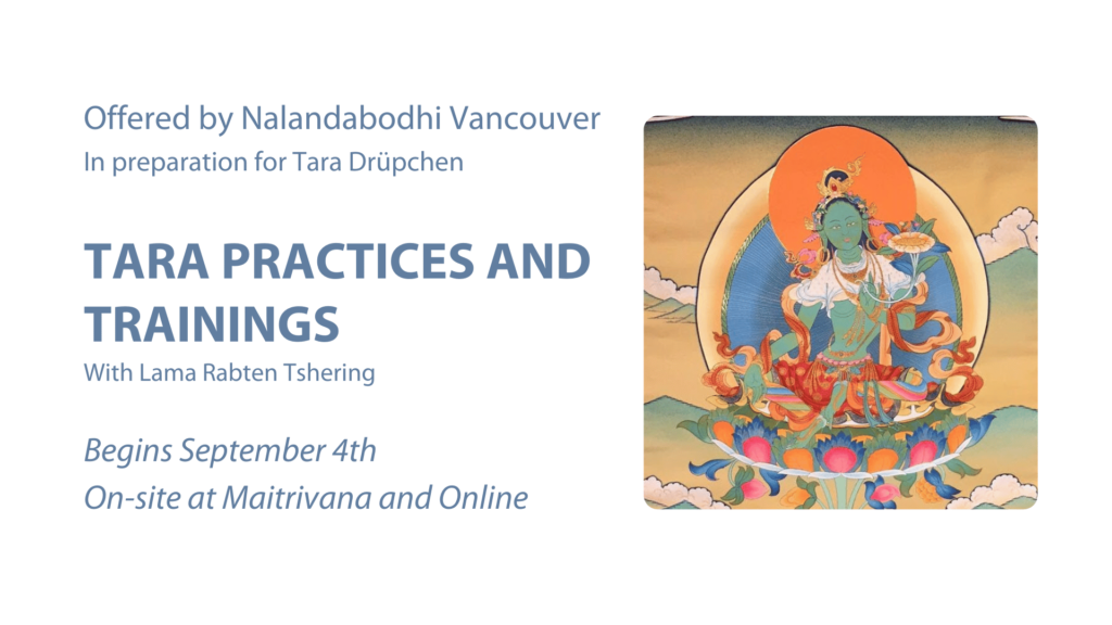 *What is a Drupchen? Drupchen is a practice-intensive retreat in the Vajrayana tradition. Nalandabodhi International has held a fall Tara Drupchen since 2016. This year, the Tara Drupchen is Fri., Sept. 22 to Sun., Sept. 24, on-site at Nalanda West (Seattle) and online. Please click here for more details.