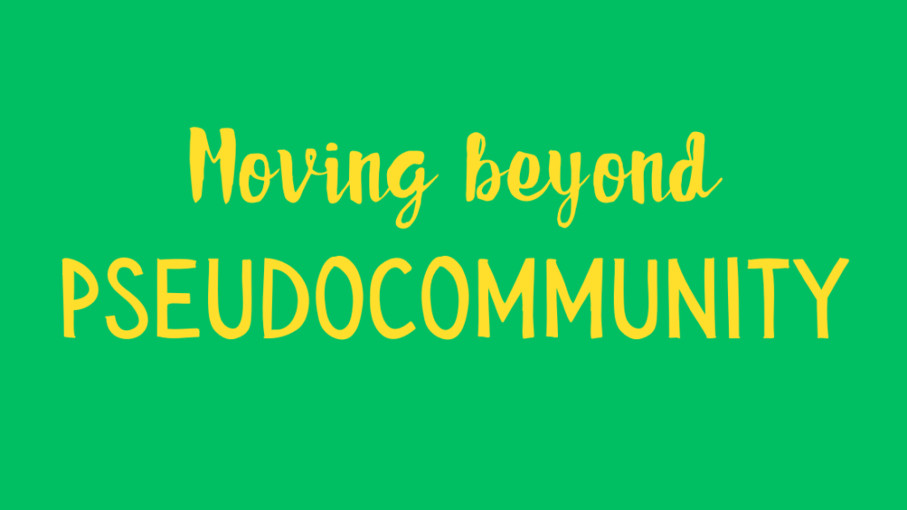 According to Dr. Peck, an American psychiatrist and author, a pseudocommunity is characterized by shallow connections and polite niceties. Members downplay differences and avoid difficult conversations. Pseudocommunities have not discovered, in the words of Stephen Sondheim, that “nice is different than good.”