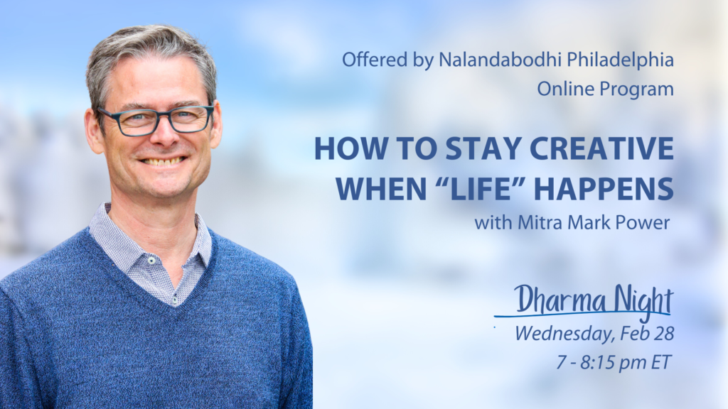 Nalandabodhi Philadelphia is inviting you to join them for a Dharma Night with Mitra Mark Power on how to stay creative when “life” happens. Dharma Night is an informal gathering where we talk about dharma and life, learning from each other about our challenges and our unique expressions of creativity. We’ll meditate a little, offer a topic, and talk together. It’s a way of connecting with community with a small investment of time and curiosity. It’s also a way we add our offering of kindness to the suffering in the world.