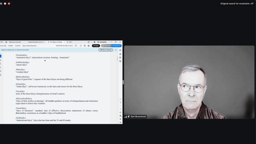 Mitra Karl offered detailed explanations on the characteristics and functions of the three most frequently presented Kāyas (Dharmakāya, Sambhogakāya and Nirmaṇākāya) but also on other kāyas, which can sometimes represent the union of these three kāyas (such as Svābhāvikakāya in Mahāmudrā) or have a particular aspect in common, for example, the three kāyas of inner luminosity in Dzogchen (Vajrakāya, Abhisaṃbodhikāya and Dharmakāya).