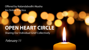 “May I be a protector to those without protection, a leader for those who journey, and a boat, a bridge, a passage for those desiring the further shore.” (From A guide to the Bodhisattva’s Way of Life by Shantideva)Nalandabodhi Akasha is hosting an Open Heart Circle practice. This is an adapted Mahayana practice that is traditionally done to support those who are ill, dying or have recently died. With all the suffering in our world today, please join a space to share and offer light, wisdom and compassion.