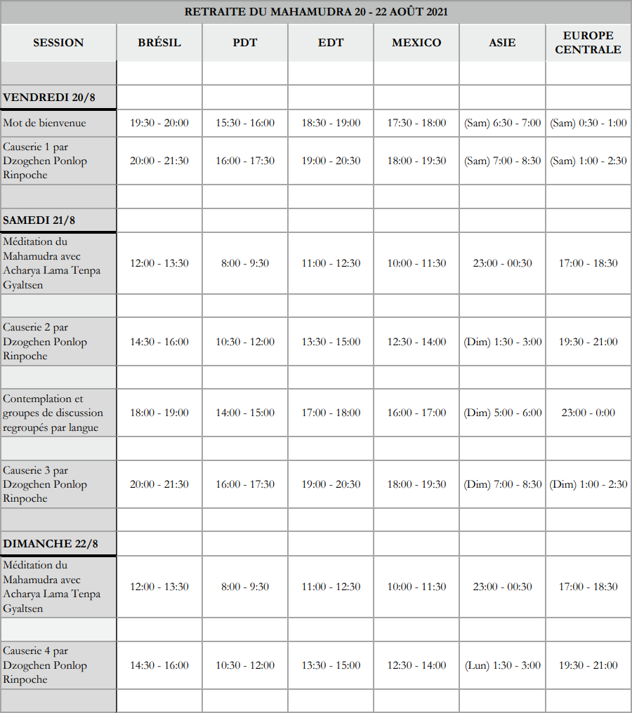 - Bien qu’il n’y ait pas de conditions préalables pour y assister, il est fortement recommandé aux participants d’avoir une pratique régulière de la méditation et une compréhension de base des principes bouddhistes.